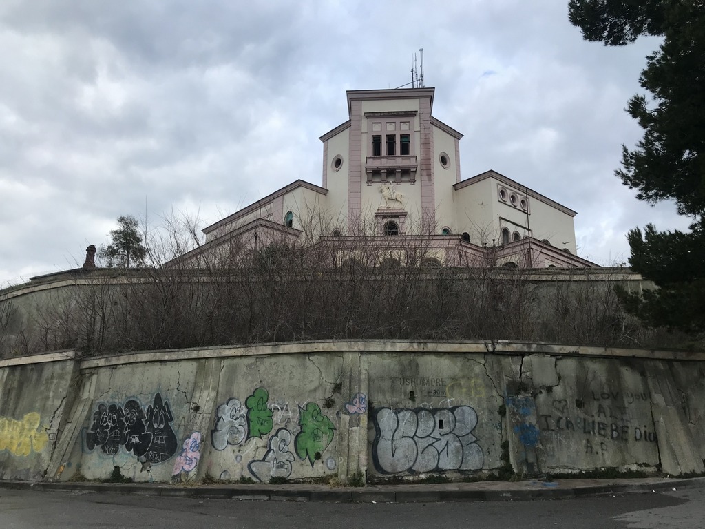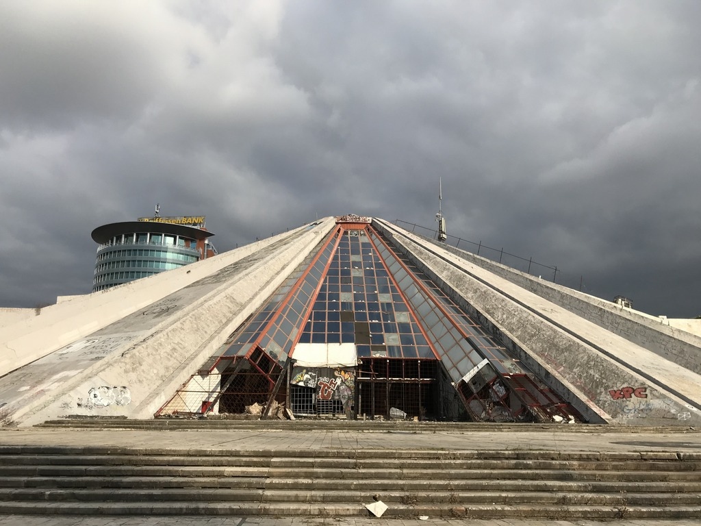 這棟金字塔式建築目前是廢棄的狀態,原本是要拆除改建新歌劇院,但後來又被否決直到2017年才宣布金字塔不會拆除而是翻新,我去的時候完全無人管理,周邊有許多垃圾和玻璃碎片,有些遊客會從外牆爬上金字塔頂端,不過上面看下來其實也沒什麼風景可言