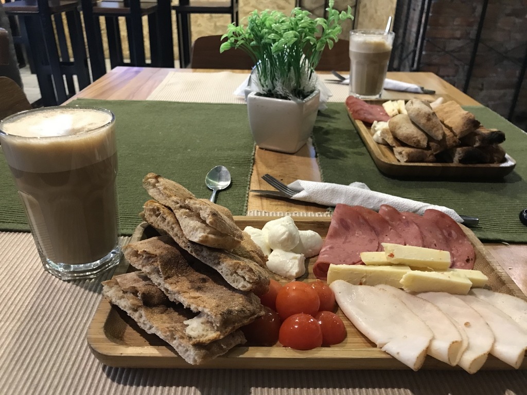 上、下兩張圖片是不同兩天的早餐,尤其上面這個餐我都覺得跟我一天的住宿錢差不多價格,咖啡還能選擇拿鐵,不過我們自己覺得可能那天老闆不在,員工想給我們吃好一點